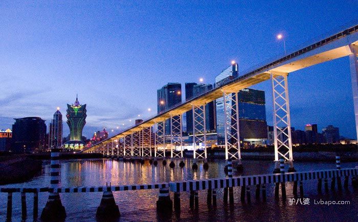 1、好喜欢这座大桥,其造型很有韵律感,夜晚漫步在新口岸海边,大桥就像一条长长的火龙悠游于海面,好靓!听说台风时,可以看到大桥在晃动,有机会要见识见识。澳门现有三座跨海大桥,近处这座,原名嘉乐庇大桥,俗称澳氹大桥,葡萄牙人设计和建设的,澳门第一座跨海大桥,1970年始建,1974年通车。